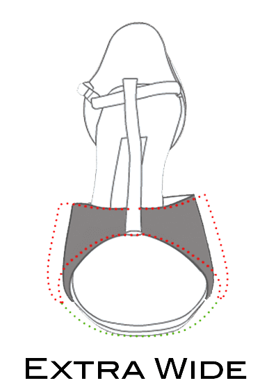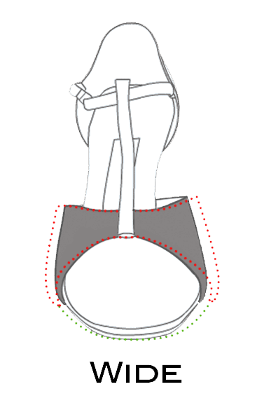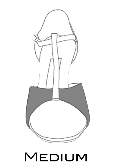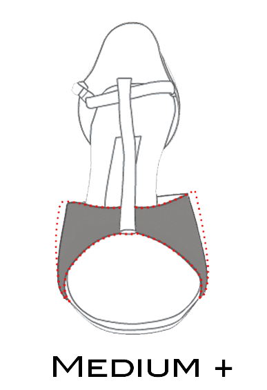 The Medium + fitting uses the same width insole as the medium fitting, but the rearmost part of the vamp (the strappy/satin section) is slightly wider, creating a larger opening for the foot. For a long time, this was the only ‘wide’ option the company offered, as they have historically found that for a large proportion of people who consider their feet to be wide, they only require additional room at the widest part of the foot, but not necessarily for the toes. | |